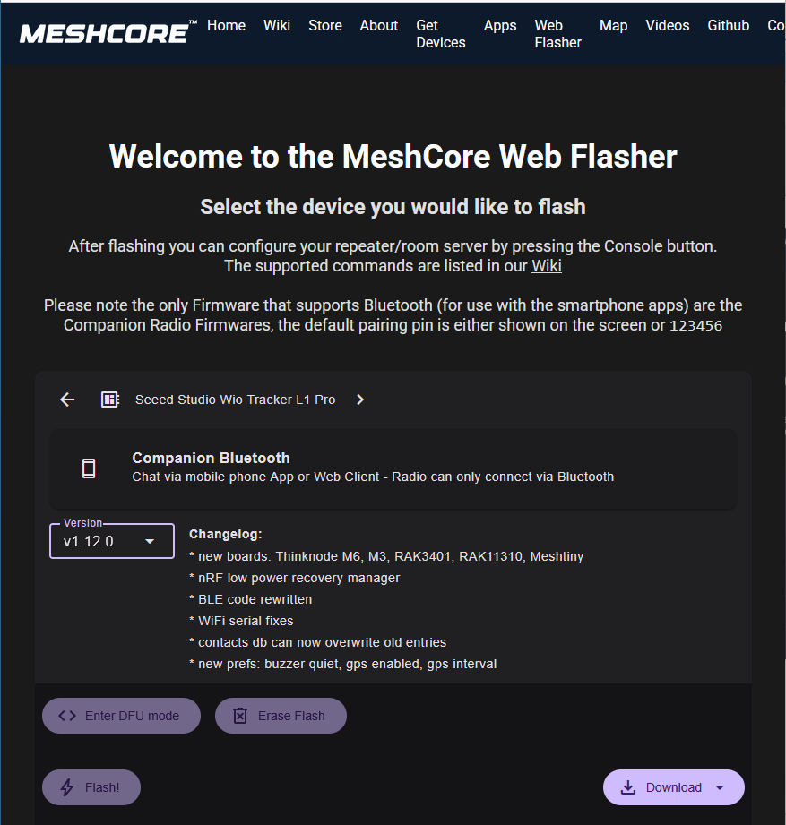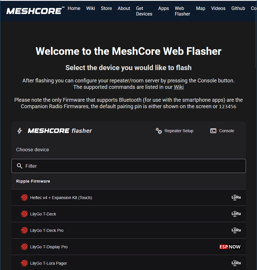 Nach Anklicken des zu installierenden Funkgeräts wird man gefragt, welchen Typ von Firmware bzw. welche Funktion man installieren möchte: "Companion", "Repeater" oder "Room Server" (siehe Abb. 15). Typischerweise möchte man das Funkgerät über die Handy-App, gekoppelt per Bluetooth nutzen, weshalb man dann "Companion Bluetooth" anklickt.