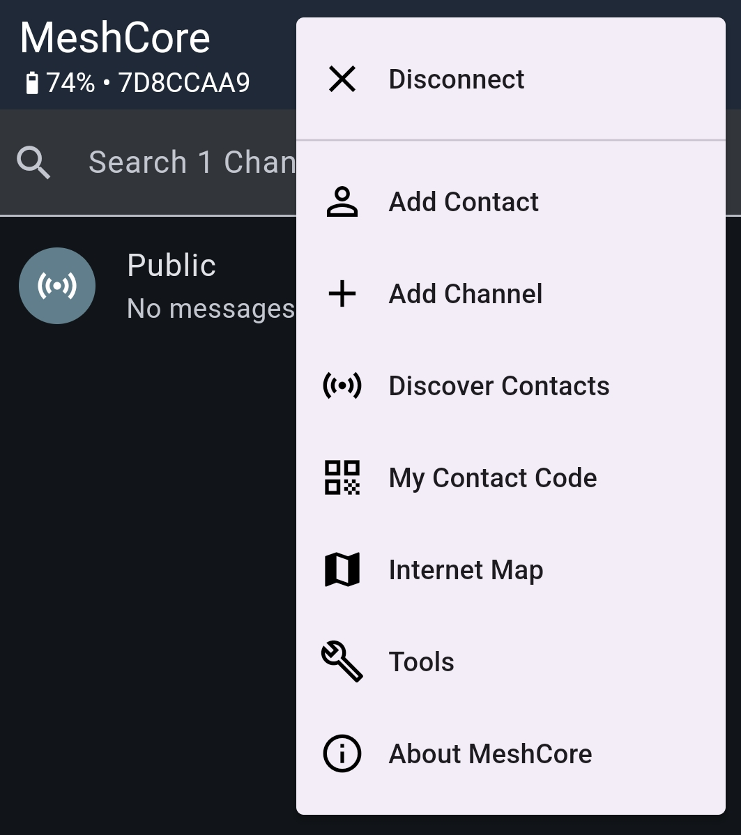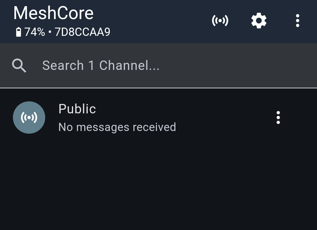 Nun zu den Channels. Klickt man zum ersten Mal auf Channels, öffnet sich ein Fenster, in dem ein Channel gezeigt wird nämlich "Public". Dieser Channel ist standardmäßig auf jedem Meshcore-Funkgerät vorinstalliert. Public ist ein öffentlich zugänglicher Kanal für alle Meshcore-Nutzer*innen. Hier kann man bspw. mal ein "Hallo" eintippen und gucken ob was passiert. Weil am Anfang Nutzer vor allem an ihrer Reichweite interessiert sind, könnte man etwas sinnvoller ein "Hallo aus XXX, kann das jemand lesen?" verschicken. In der Hoffnung, dass sich jemand erbarmt, der sich an seine eigenen ersten tapsigen Schritte erinnert und ein paar nette Worte zurück schreibt. In großen Städten kann hier sehr viel geplappert werden, in kleinen Dörfern kann dieser Kanal geeignet sein, um die gesamte Dorfkommunikation darüber abzuwickeln.