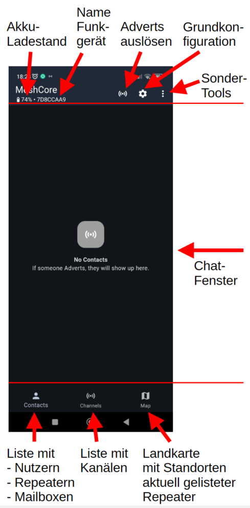 Der Einstieg für Nutzer*innenNachfolgend zeige ich die wesentlichen Funktionen der App, um den Einstieg in die Nutzung von Meshcore zu finden.