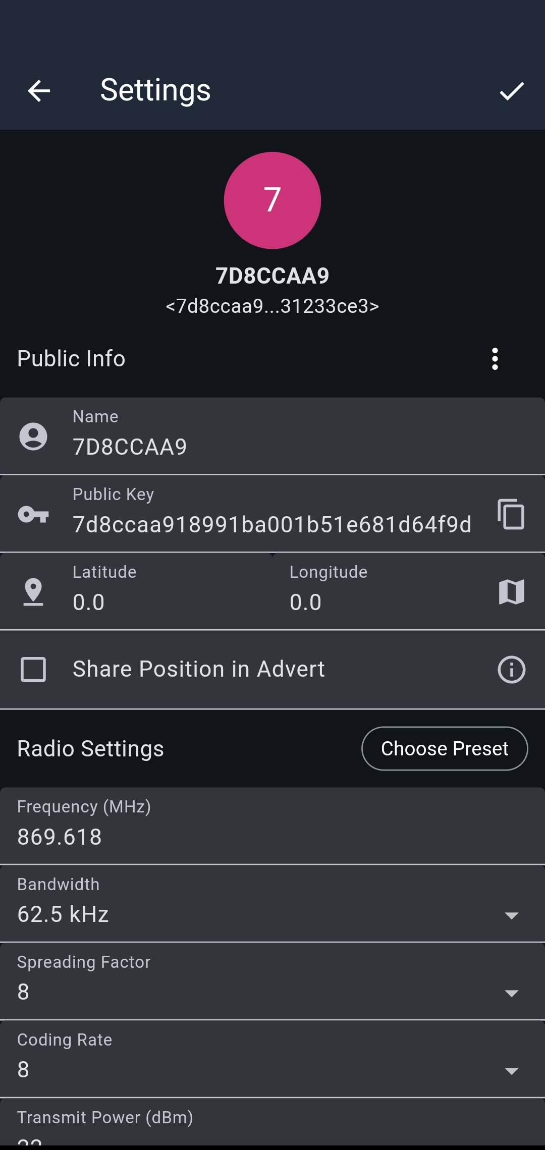 Das war die wesentliche Konfiguration und Funktion eines Meshcore-Funkgeräts mit der zugehörigen Android-App, um loslegen zu können. Zurück noch mal zur Grundkonfiguration der "Settings", dort lässt sich vieles einstellen. In die Grundkonfiguration gelangt man, wenn man oben auf das Zahnrad, zweites Symbol von rechts, tippt. Scrollt an im Setting-Fenster ganz nach unten unten, findet sich die Option "Device Info", nach Antippen wird man über die Auslastung des zur Verfügung gestellten Speichers des Funkgeräts informiert. Einige Fungeräte bieten oft nur 100kB Speicher. In diesen Fällen muss man darauf achten, recht früh Kontakte und Chatverläufe zu löschen. Den "Namen", den das Funkgerät trägt und der im Netz angezeigt wird - und den man ganz zu Beginn der Settings bestimmen kann -, kann man jederzeit ändern. Ich habe bei inzwischen wohl mehreren Hundert Kontakten, die ich in Contacts gelesen habe, aber noch nie "Vorname Nachname" gelesen, obwohl das vom Konzept her naheläge: Ein Gerät = eine Nutzer*in. Funkamateure geben hier bspw. gern ihr Rufzeichen an, andere verweisen auf ihre Webseite, einige wenige schreiben ihre Mailadresse hinein. Letzteres kann sinnvoll sein insbesondere in Gegenden mit wenig Funkverkehr. Dort besteht verstärkt die Neigung, Kontakt zu anderen Nutzer*innen zu suchen, damit man sich gegenseitig helfen kann, um das Repeater-Netz in seiner Umgebung aufzubauen.